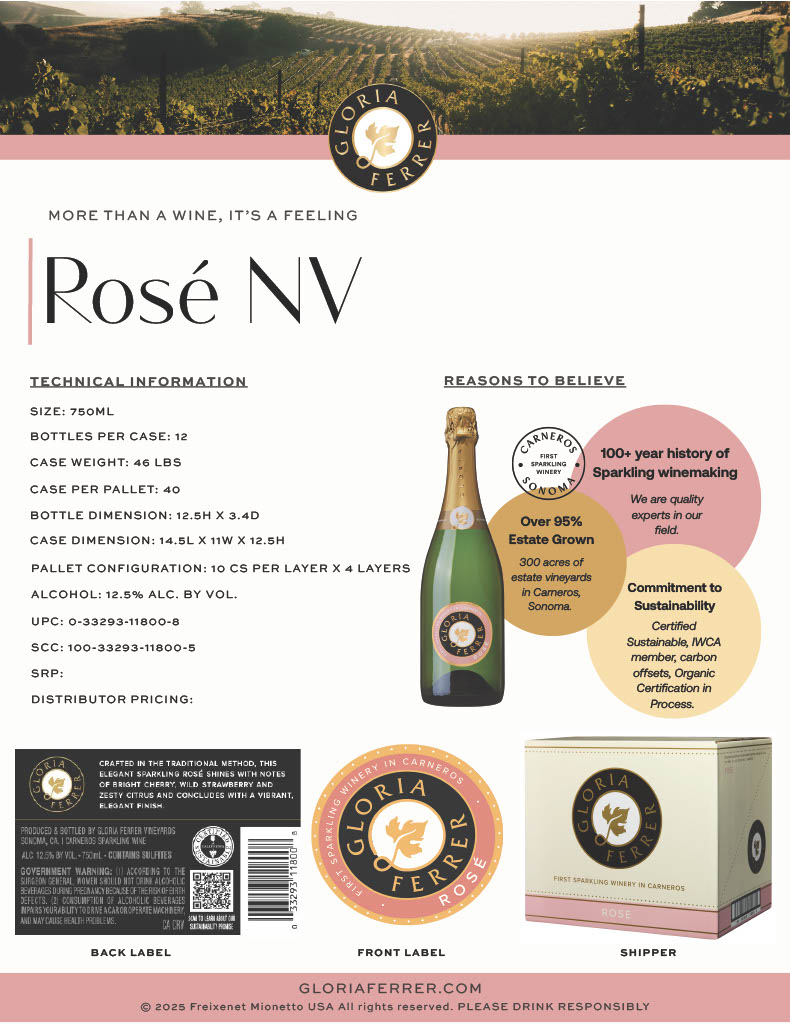 Yes. Gloria Ferrer trade assets may be used for approved promotional purposes in connection with the sale or marketing of Gloria Ferrer wines. To maintain brand integrity, assets should not be altered, cropped, or otherwise modified without prior written approval.